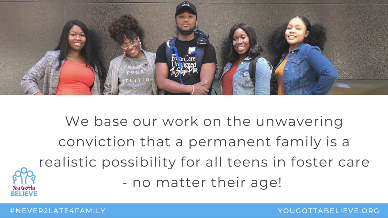 You Gotta Believe is one of few organizations nationwide working solely with older youth in foster care. We believe that family is the solution and work to find permanent, loving families for teens and young adults.