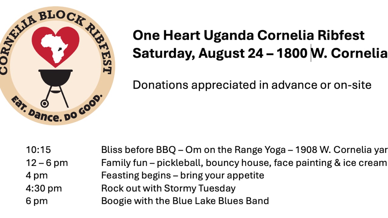 Bring your appetites, we're having our second annual ribfest in support of One Heart Uganda. We'll kick things off at 4:30pm with music by Stormy Tuesday.Β Later, get ready to move to the vibes of the Blue Lake Blues Band.
