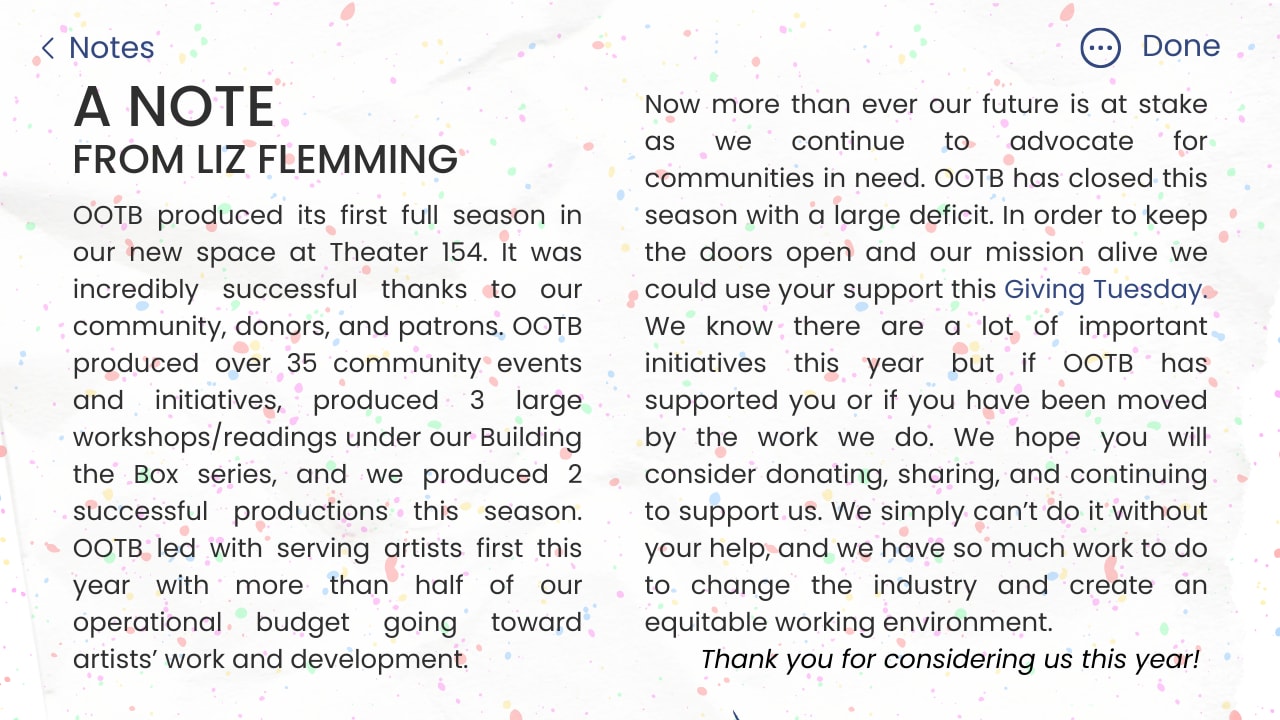 This year OOTB produced its first full season in our new space at Theater 154. It was incredibly successful thanks to our community, donors, and patrons. OOTB produced over 35 community events and initiatives, produced 3 large workshops/readings under our Building the Box series, and we produced 2 successful productions this season. OOTB led with serving artists first this year with more than half of our operational budget going toward artists’ work and development.