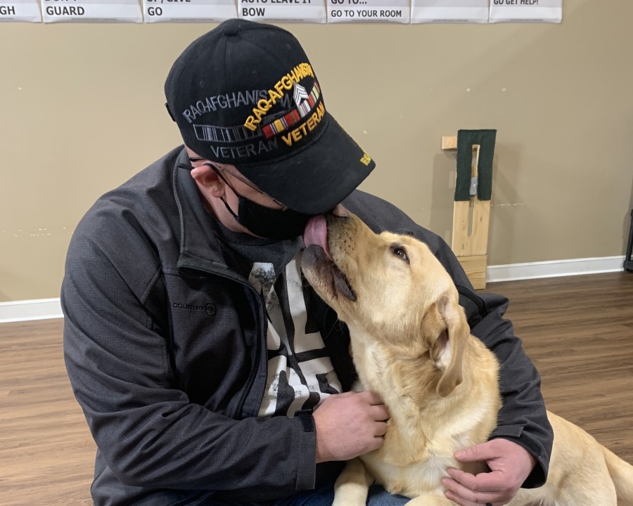 David's story starts in 2011 when on deployment to Afghanistan, David survived an attack by a suicide bomber. David and his team were responsible for refueling military vehicles, so they were no strangers to being under fire. On that day in May of 2011, the attack came when least expected. The suicide bomber appeared at David's base's gate. According to David, he was "far enough away not to get killed, but close enough to get knocked on my tail and get knocked out." He suffered a Traumatic Brain Injury due to the explosion and was later diagnosed with Post-traumatic Stress Disorder. Upon returning home, David went to a dark place. Like many of our Warriors, he began drinking and drifting away from his family members. His wife urged him to get help. Through the Hunter Holmes McGuire VA Medical Center, David discovered Paws for Purple Hearts' Canine-Assisted Warrior Therapy® program.---- A unique therapeutic intervention, this program focuses on creating opportunities for positive, meaningful interactions with our Service Dogs in Training and their fellow Warriors. Guided by our brilliant staff of highly experienced Program Instructors, Warriors like David get the chance to reinforce commands and behaviors that are vital for a Service Dog in Training—working with the dogs resonated with David, inspiring him to apply for a Paws for Purple Hearts Service Dog. In February 2021, David got the call that Paws for Purple Hearts had a match for him. Two months later, David went through an intensive two-week training course where he bonded with his forever partner, a yellow lab named Scout. David and Scout clicked instantly. Scout's intuition predicted David's anxiety attacks while Scout's drive to work assisted David with physically demanding tasks like picking up David's cane. Today, you wouldn't recognize David as the man he was before Scout. He stands straighter and hardly uses his cane anymore. If you ask him about Scout, he smiles and says, "Scout has helped my confidence so much that I feel happier when I wake up."