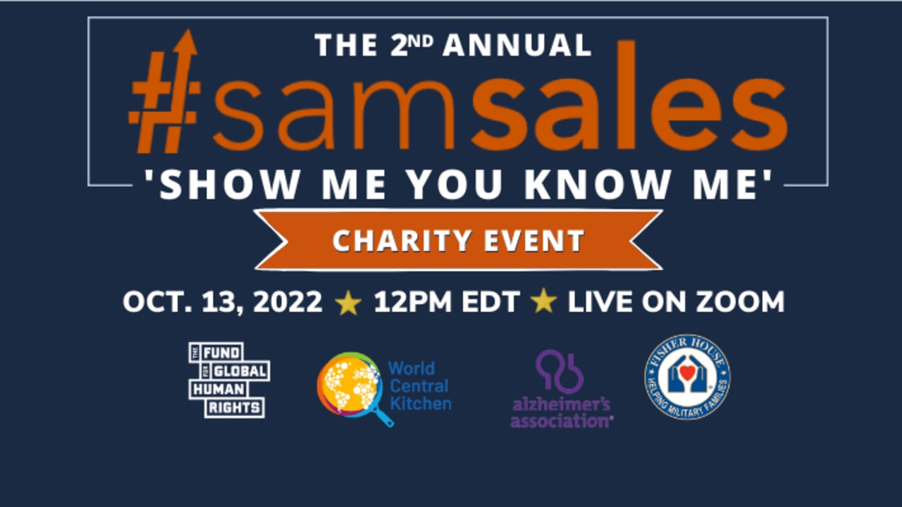 The #samsales Team is ecstatic to run our second annual virtual charity event supporting The Alzheimer's Foundation, The Fisher House Foundation, The Fund For Global Human Rights, and World Central Kitchen. We plan to host our event on Thursday, October 13th from 12:00-1:30pm ET, where a line up of organizations will each have 5 minutes to pitch their product to our VIP Panel of judges. In the process, we'll collect donations from those pitching to benefit our chosen charities while also giving the sales community a great way to network and help them get some quality at-bats with heavy hitters in their target markets.