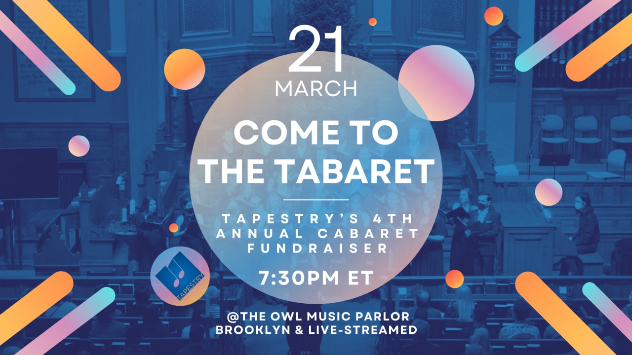 We are thrilled to announce our 4th Annual Tabaret: Tapestry's Cabaret Fundraiser, featuring performances by our wonderfully talented choir members. For the first time, this year's Tabaret will be *live in person* in Brooklyn, as well as live-streamed via Zoom link!